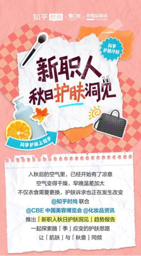 - 10月24日,知乎联合CBE中国美容博览会推出《新职人秋日护肤洞见》趋势报告。报告显示,新职人秋季护肤以“养”为主,养肤防晒和皮肤修复都是知乎新职人在九月最...